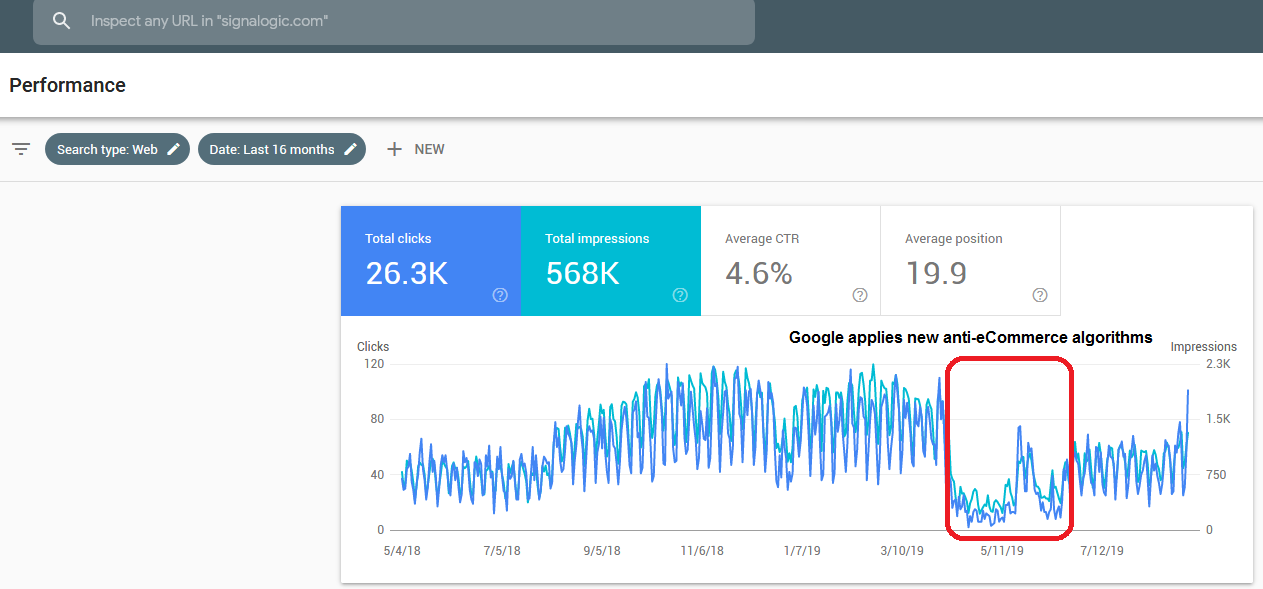 The Problem The problem is that Google's indexing algorithms may inexplicably select incorrect "canonical pages" for a website, mistakenly selecting as "canonical" unrelated pages elsewhere on the site. This allows Google's algorithms to label completely original content as "duplicated" -- effectively making a mistake that no human would ever make -- and thus blocking original pages from appearing in Google search results. This can happen for 100s of pages on a website, blocking the entire site from appearing in Google search results, or if not the entire site, then its crucial pages (also known as "landing pages"). And, this can happen even though the blocked pages contain 100% original content, not duplicated anywhere else on the web, even including registered trademarks or copyrighted material, and otherwise following all of Google's published rules and guidelines. Probably, the new canonical page algorithm was implemented due to e-commerce abuses, for example 100s of e-commerce sites with pages having nearly identical content. Google has attempted to address this in the past, but -- as might be expected in any measure/counter-measure situation -- the e-commerce sites got better at subtly changing their pages so that Google's algorithms would see them as different. Basically, it's bot vs. bot warfare, and now Google has the upper hand again. Of course Google's focus on e-commerce completely ignores independent vendors providing infrastructure software solutions, which is the case for Signalogic. Below is a 16-mo performance history for signalogic.com, showing the time period when the canonical algorithm change "hit":